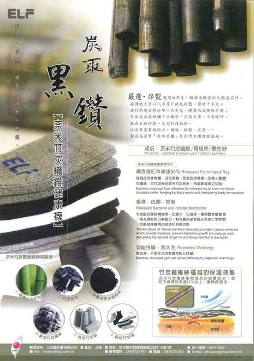 - 4. 竹炭結構緻密、孔隙多,具很強的吸附分解能力,能發揮優異的除臭、抑菌功能。 如製成竹炭襪便是一雙相當優異的除臭襪。